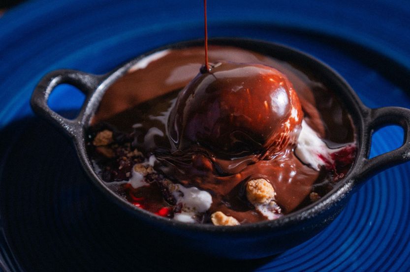Pečené višně s ořechovou drobenkou, smetanová zmrzlina, horká čokoláda. Dezert, který hraje na všechny smysly. Višně naložené v amarettu, mandlovém likéru, a ve Višňovce mají lehce hříšný, dospělý charakter. Přikrývá je drobenka z másla, mouky, vlašských ořechů, mandlí a cukru, která se krátce zapéká dozlatova. Horký dezert pak dostane kontrast v podobě smetanové zmrzliny a celé kouzlo se dokončí přímo před hostem – přelitím horkou, poctivě hořkou čokoládou.