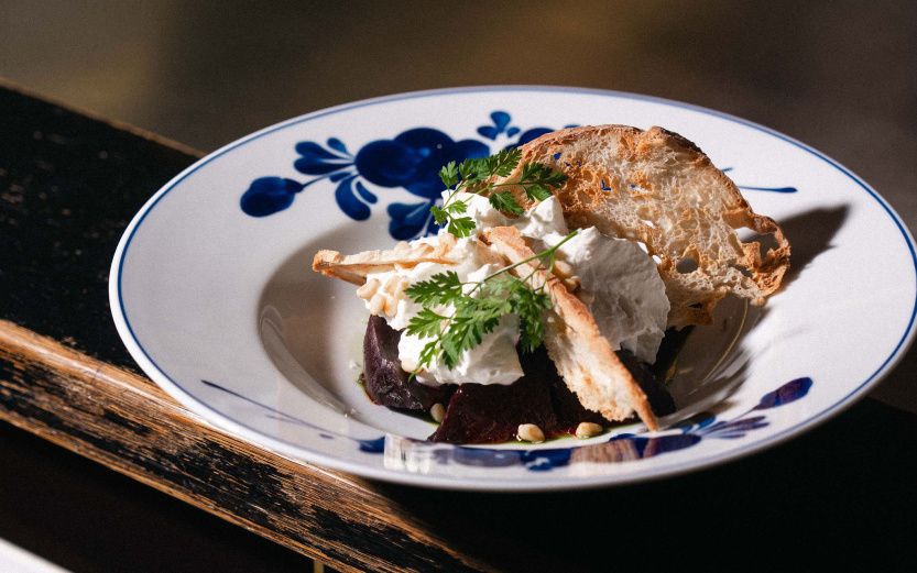 To je patrné hned u prvního předkrmu – šlehaného kozího sýru s pečenou červenou řepou, tymiánovým medem a piniemi, chipsy z domácího chleba. Kozí sýr je našlehaný do jemné pěny, aby nepřebíjel ostatní chutě. Pod ním leží pomalu pečená řepa, sladká a šťavnatá. Důležitým prvkem je tymiánový med, který si připravujeme sami.